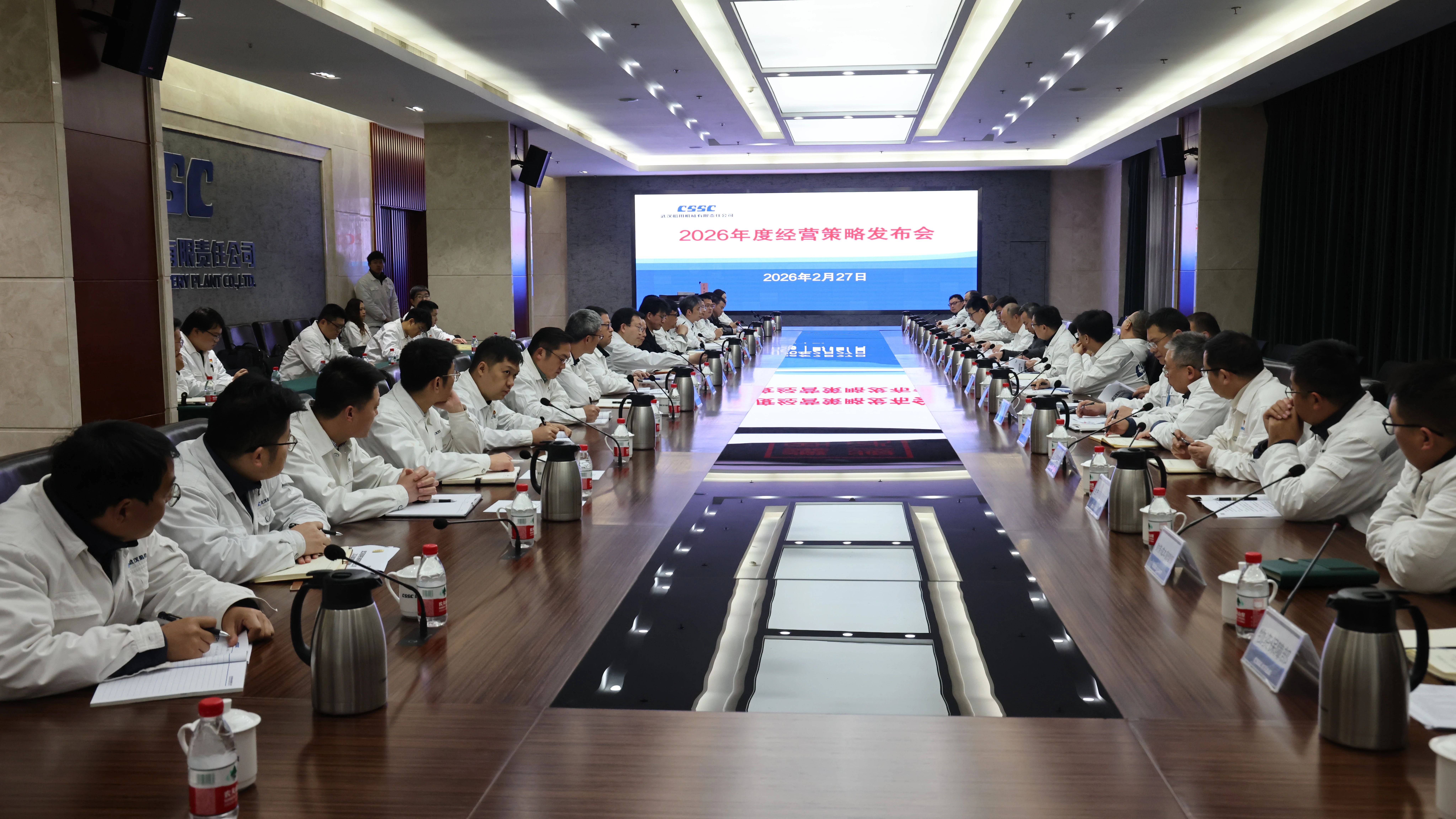2月27日上午,中船武汉船机在研发楼102会议室召开2026年经营策略发布会,公司党委副书记、总经理程立兵,副总经理潘文胜,总会计师、工会主席陈世龙,副总经理孙凯、副总经理霍小剑、副总经理胡发国、副总经理程文池出席会议。会议由程文池主持。