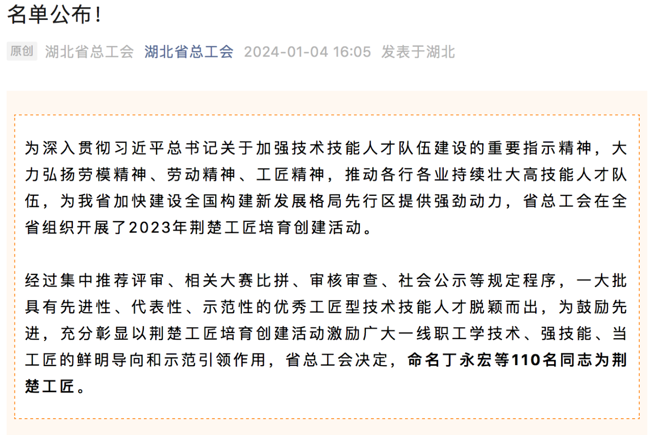 1月4日,湖北省总工会公布2023年“荆楚工匠”人选名单,中国船舶武汉船机特种机械部罗杰荣获“荆楚工匠”称号。
