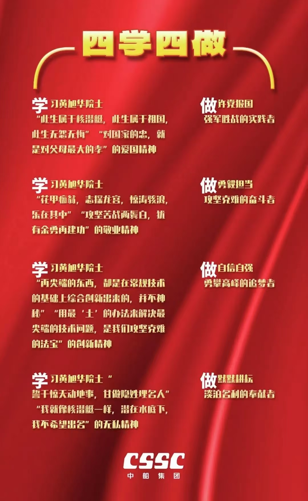 近日,中船集团党组下发通知,号召全集团深入开展黄旭华院士先进事迹“四学四做”活动。公司全体员工要深入学习宣传黄旭华院士先进事迹、优秀品格和优良作风,继承黄旭华院士遗志,弘扬核潜艇精神,赓续中船文化,在新时代新征程中,争做对党忠诚、对事业执着的奋进中船人,自觉将个人奋斗融入到中船集团发展大局中,切实将学习活动成效转化为完成全年任务目标、推动“十四五”圆满收官的实际成效。