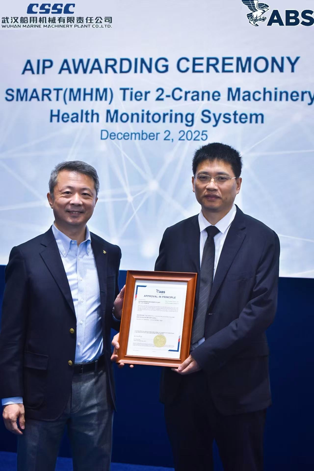 12月2日,2025年中国国际海事技术学术会议和展览会开幕首日,中船武汉船机开发的海工吊机智能化健康监测系统(SMART系统)获得ABS船级社SMART(MHM TIER 2)原则性批准(AIP),这是国内海工吊机首个成功取得该AIP认证的系统。ABS船级社技术副总裁谷海、中船武汉船机副总经理胡发国出席发证仪式。